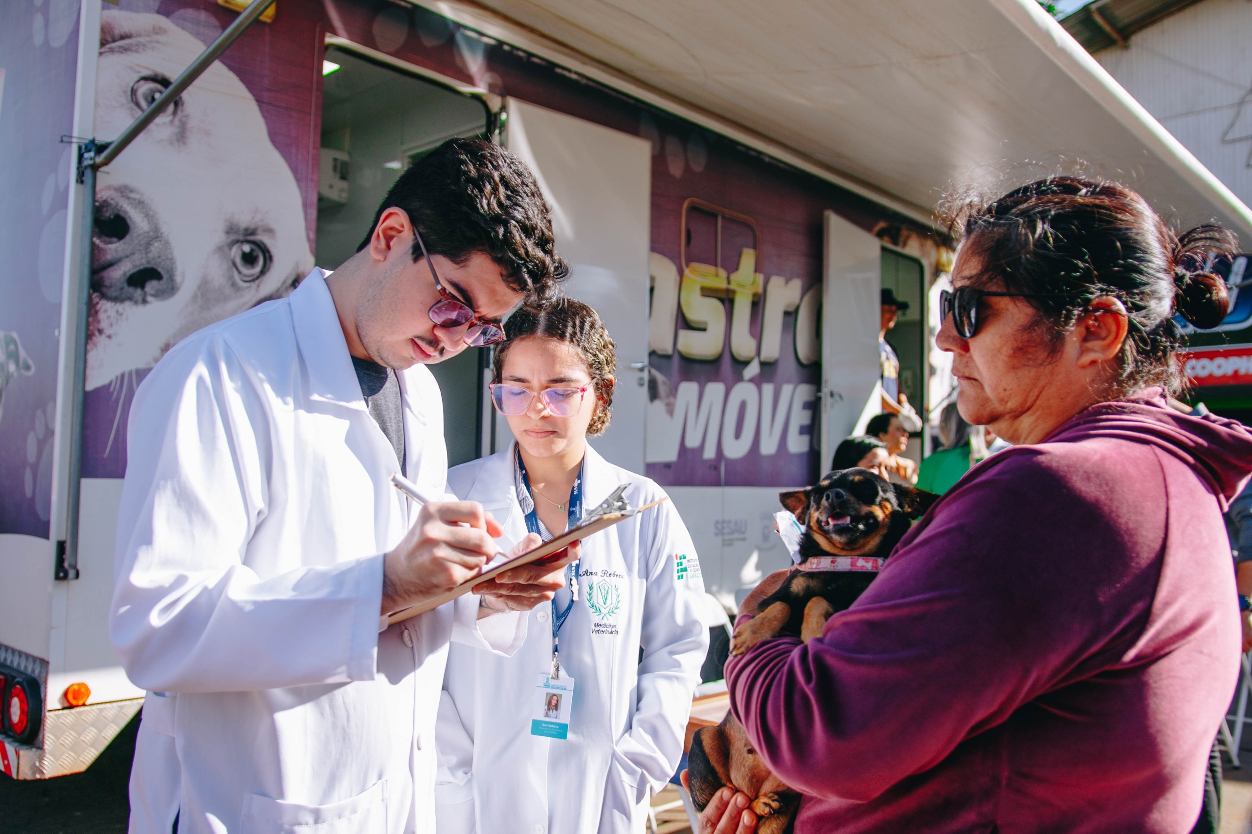 #ParaTodosVerem: Foto mostra a equipe do CCZ ao lado de uma tutora, que segura o seu cachorrinho durante a ação realizada no bairro.